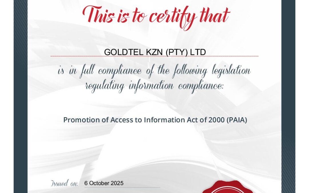 GOLDTEL KZN PTY LTD – PAIA Certificate